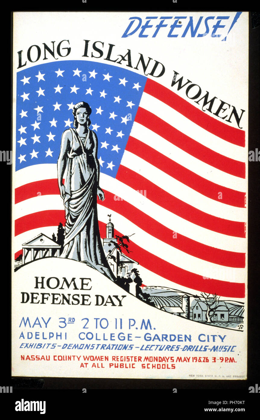 Poster Announcing Activities Related To Home Defense Held At Adelphi College Garden City New York Showing Figure Of Liberty Standing Before American Flag Stock Photo Alamy